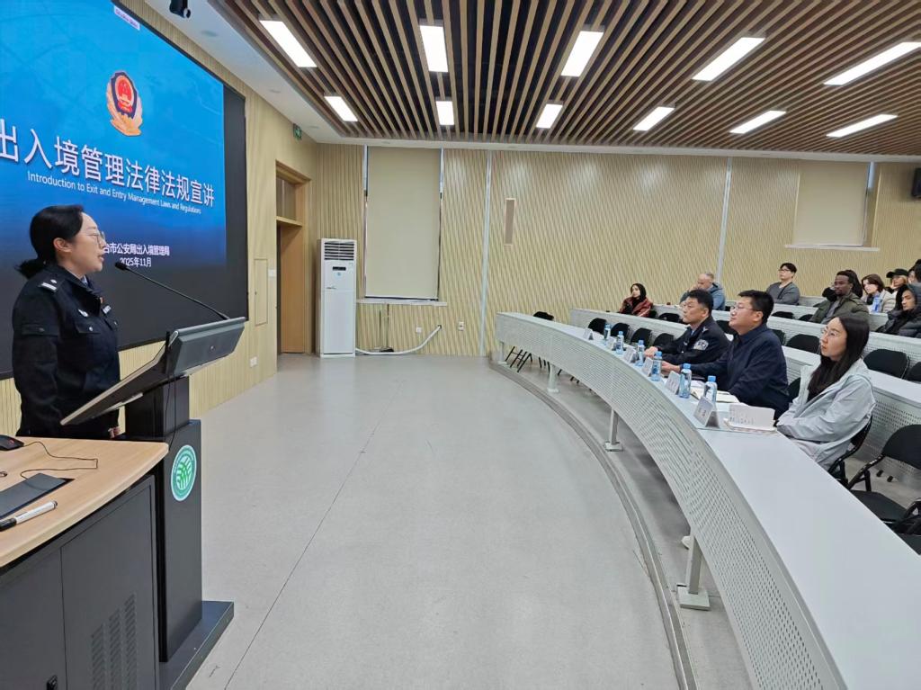 在法律法规宣讲环节,烟台市公安局出入境管理局付青晴警官结合一线工作经验,围绕留学生群体最关心的签证证照办理流程、出入境管理相关法律法规等内容展开讲解。宣讲内容实用易懂,帮助留学生提升了法律意识与合规意识。